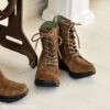 優しくやわらかな印象のブラウンスエード。指先から足回りが紐で微調整できるから、甲の高い方や足首まわりのサイズが気になる方にもおすすめ。様々な足タイプの方に合わせられる万能ブーツです。