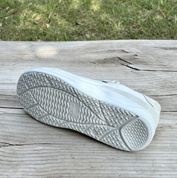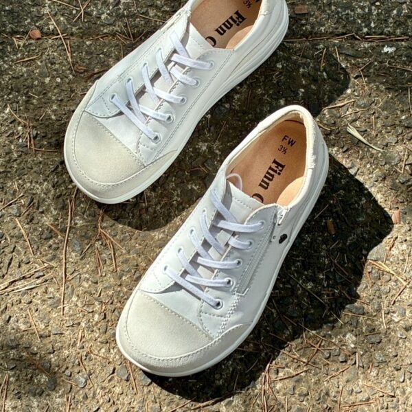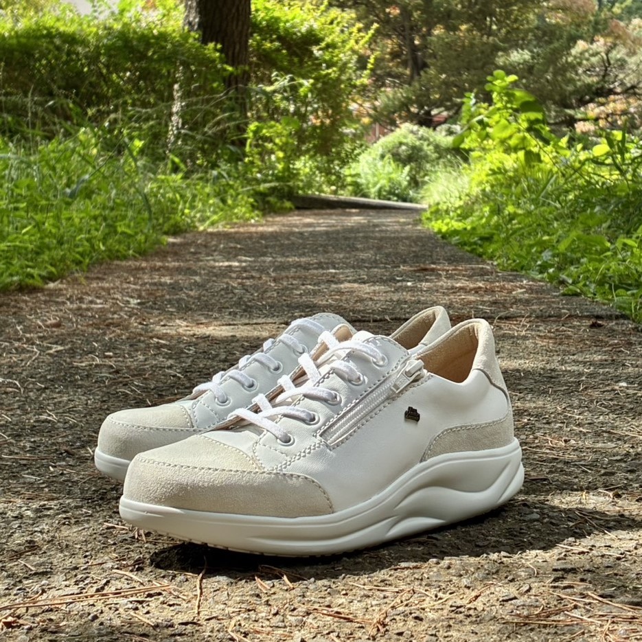 しっかり足を支え、足が自然と動く、揺りかご型ローリングソールのウォーキングシューズ「Hachiouji」の新色ホワイト。